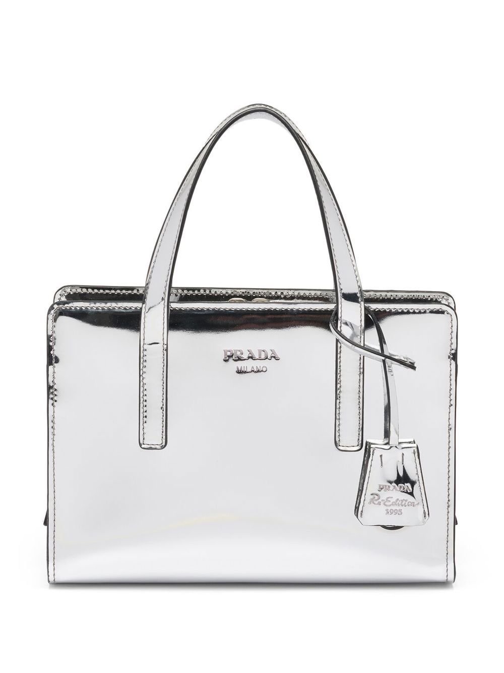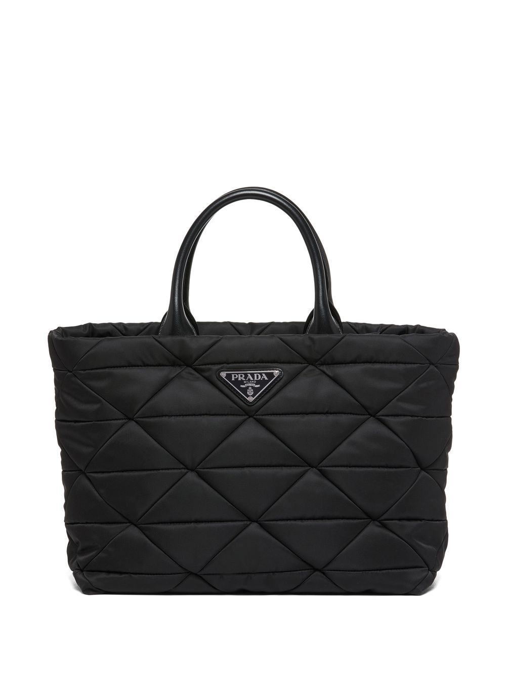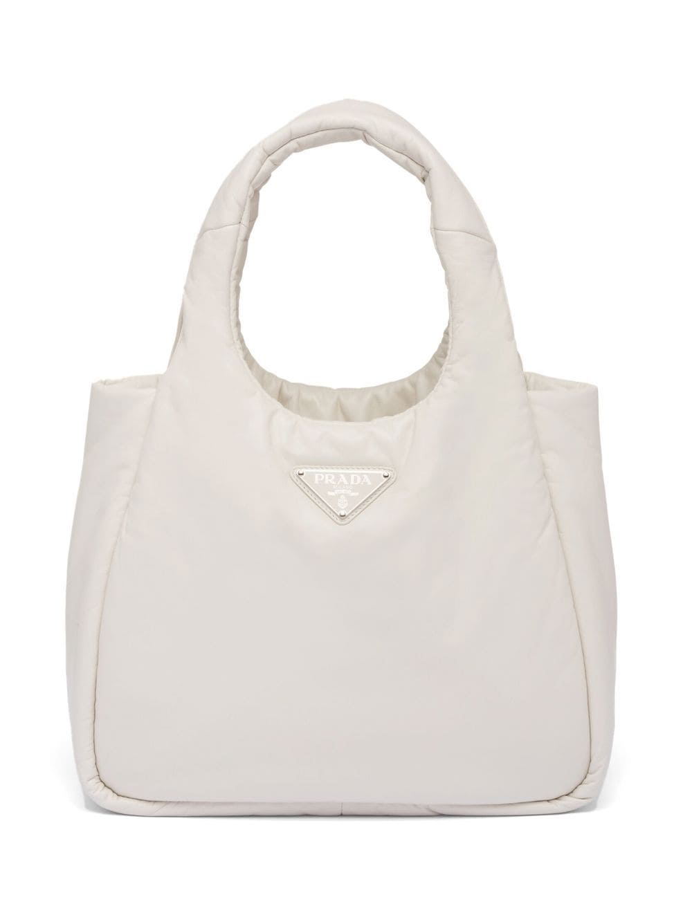- logo-knit gingham tote bag from PRADA featuring alabaster, white, straw, intarsia-knit logo, enamel triangle logo, internal logo patch, woven raffia design, open top, two top handles and main compartment.