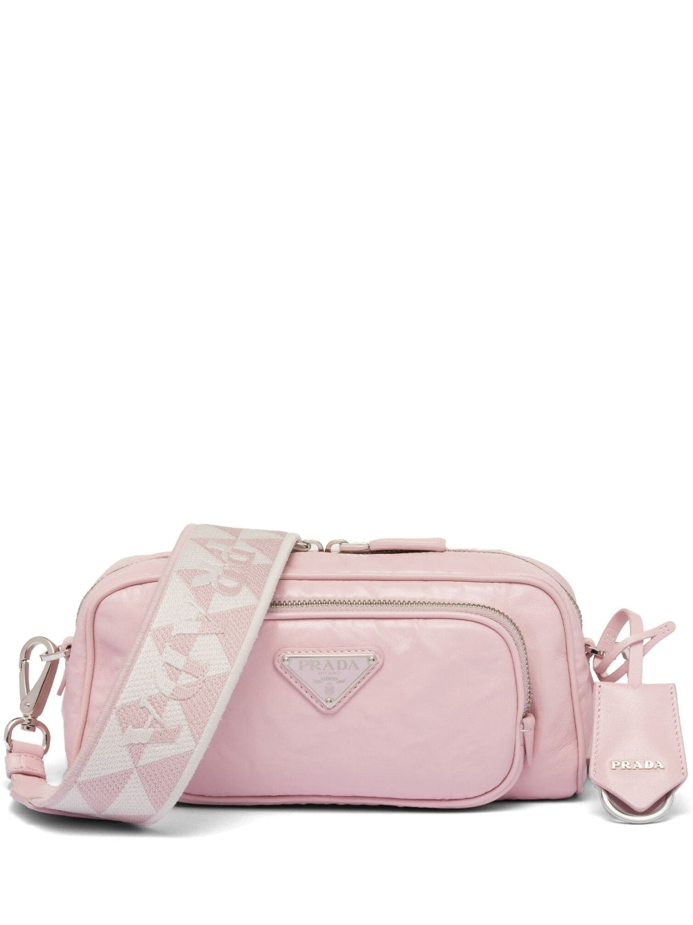 Prada’s backpack offers a masterclass in elegance. Presented in minimalist black, it’s crafted from contrasts of Re-Nylon and glossy crocodile-effect leather. It’s simply decorated with a signature triangle logo plaque.